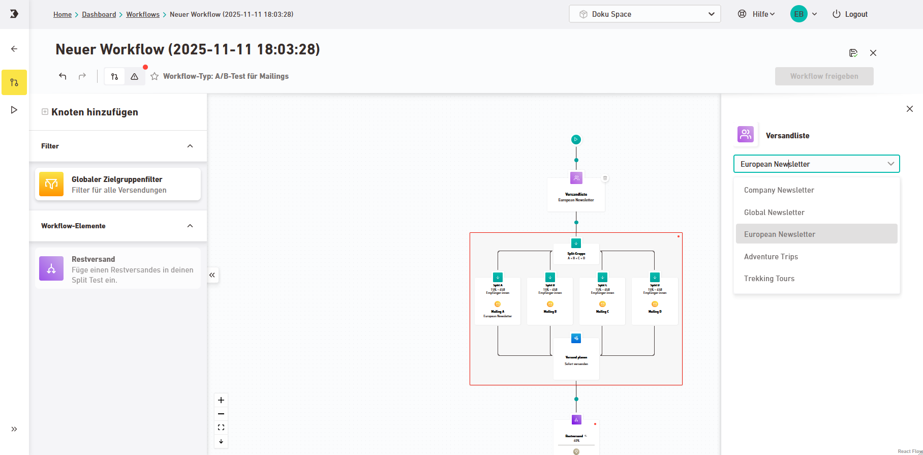 Ergänze in Deinem Workflow alle fehlenden Objekte, wie z. B. Liste oder Mailing.