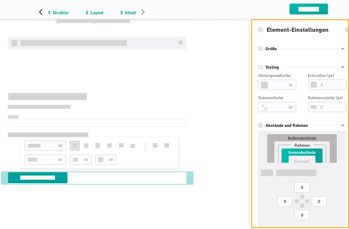 Gestaltung: Achte darauf, dass das richtige Formularelement türkis hervorgehoben ist und gehe in die Element-Einstellungen. Dort sind vor allem die Bereiche "Abstände und Rahmen" und "Styling" (Buttons) für Dich interessant.