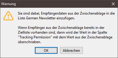 - Klicken Sie auf Abbrechen, wenn Sie den Wert der Spalte Tracking Permissionnicht übernehmen möchten. Der Einfügevorgang wird abgebrochen. Es werden keine Empfängerdaten in die Zielliste übertragen.