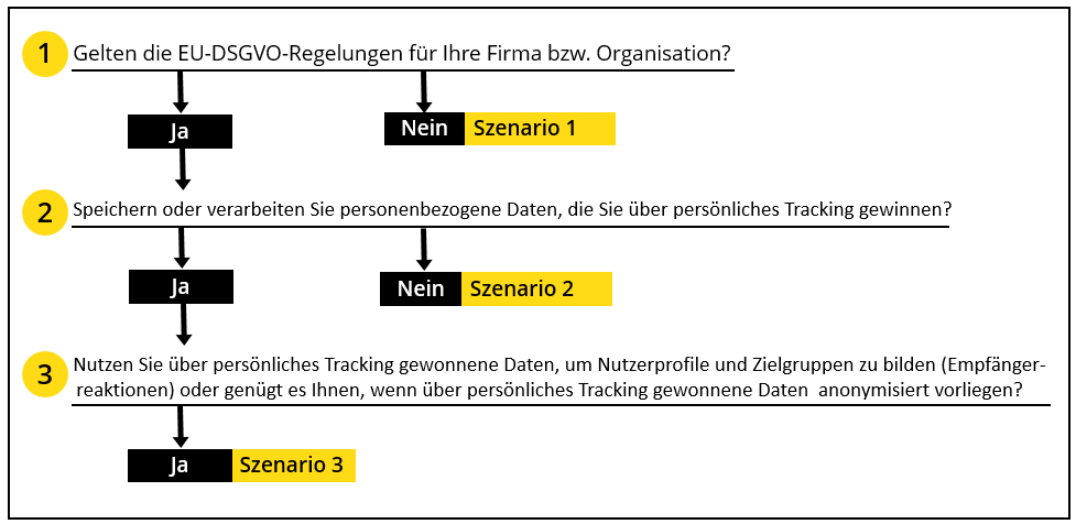 Je nachdem, ob Sie diese Fragen mit Ja oder Nein beantworten, ergeben sich drei zentrale Szenarien für den Einsatz von Inxmail Professional. Diese Szenarien unterscheiden sich deutlich im Umfang der Maßnahmen, die Sie ergreifen sollten.