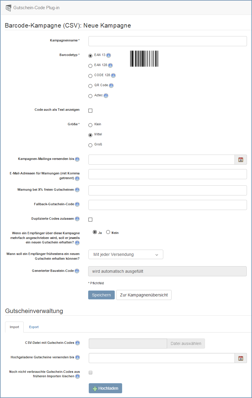 Sie gelangen auf die Seite Barcode-Kampagne (CSV): Neue Kampagne.