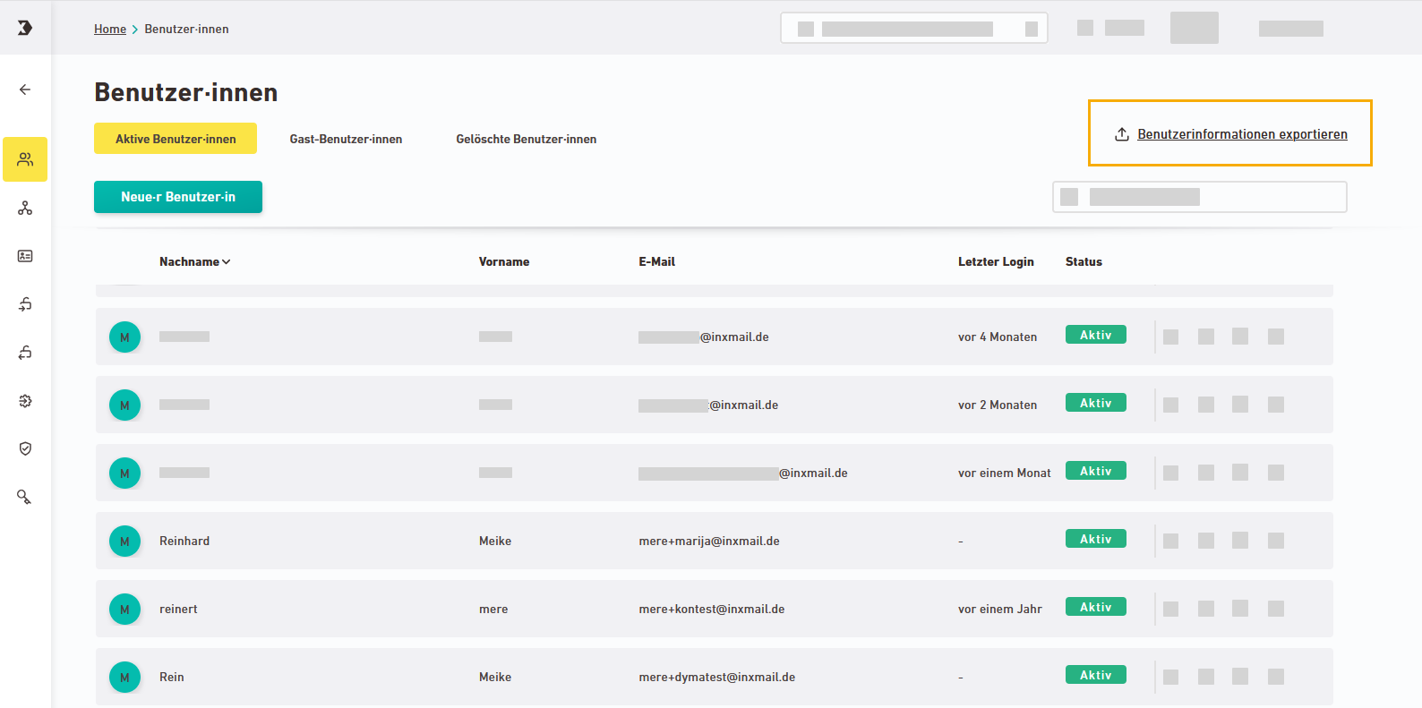 You can export the data of all your users in a CSV file for documentation or further analysis in other systems. Click on "Export user information" at the top right of the overview table.
