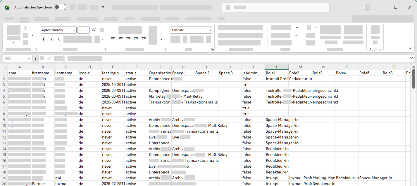Inxmail saves the CSV file in your usual download folder. It contains all permissions as well as information on the status (active / blocked) and the last login.