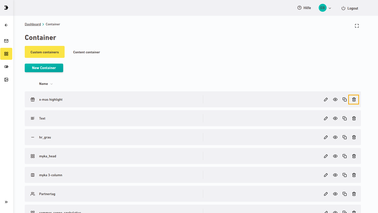 Note: Inxmail containers are provided by Inxmail. There is no way for you to edit or delete Inxmail containers. That's why there is no tab for Inxmail containers in the container overview.