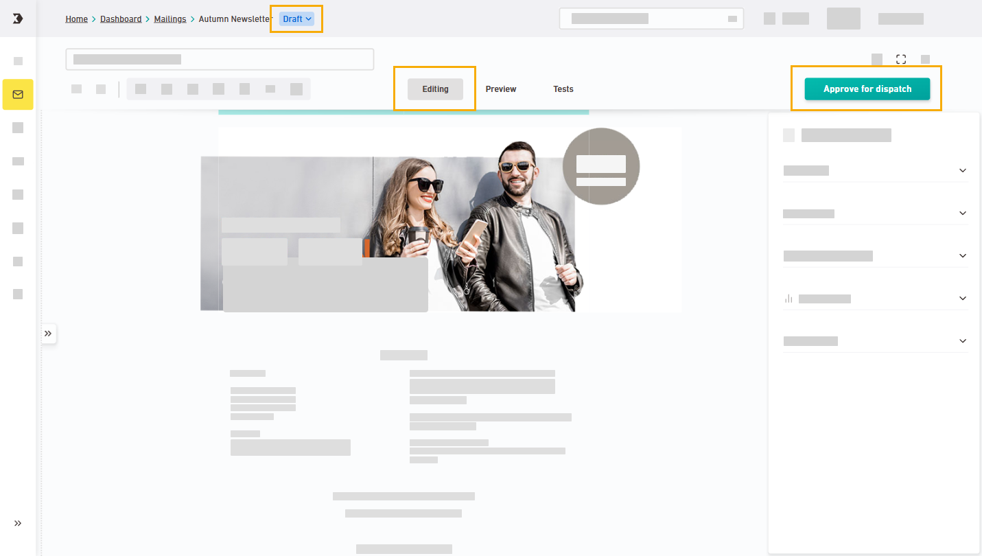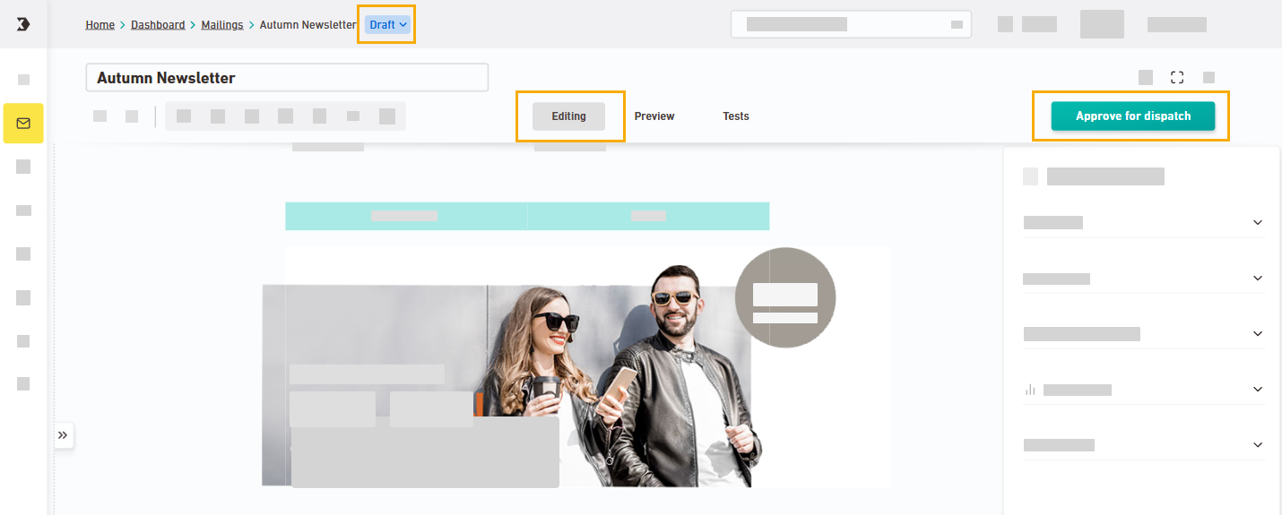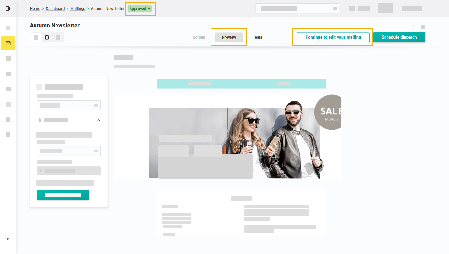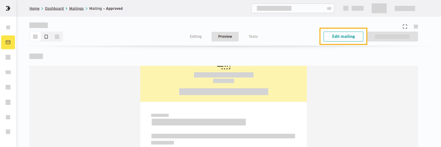 Approved mailings open automatically in the "Preview" tab. The "Editing" tab is dimmed.