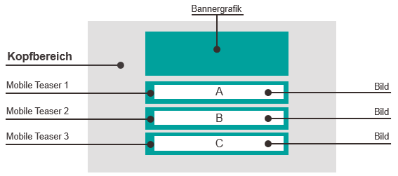 To set up a mobile graphical navigation bar, you need to add a mobile teaser in the header for each menu item. You then need to store an image for each menu item in the respective mobile teasers. Each image should be 600 pixels wide. In the mobile view, it will automatically be scaled to the corresponding display width of the mobile device.
