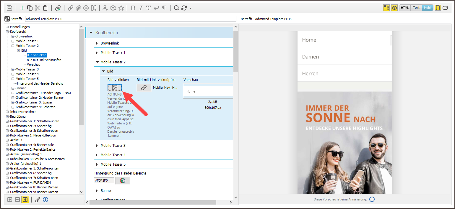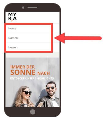 There are three menu items in this example, Home, Women and Men. Images with a width of 600 pixels have been linked in the respective mobile teasers.