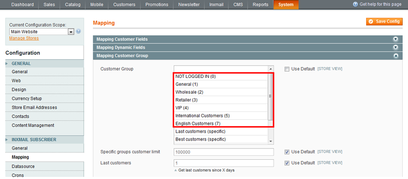 After you have created a customer group in Magento, it appears under Inxmail > Configuration > Mapping in the Mapping Customer Group area: